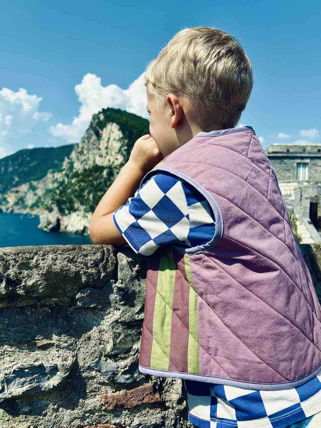 Die Weste hat einen geraden, kurzen Schnitt und kann mit einer Schleife vorne geschlossen werden.