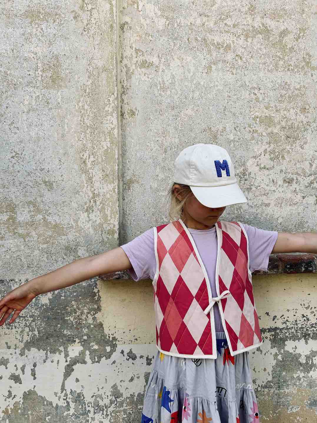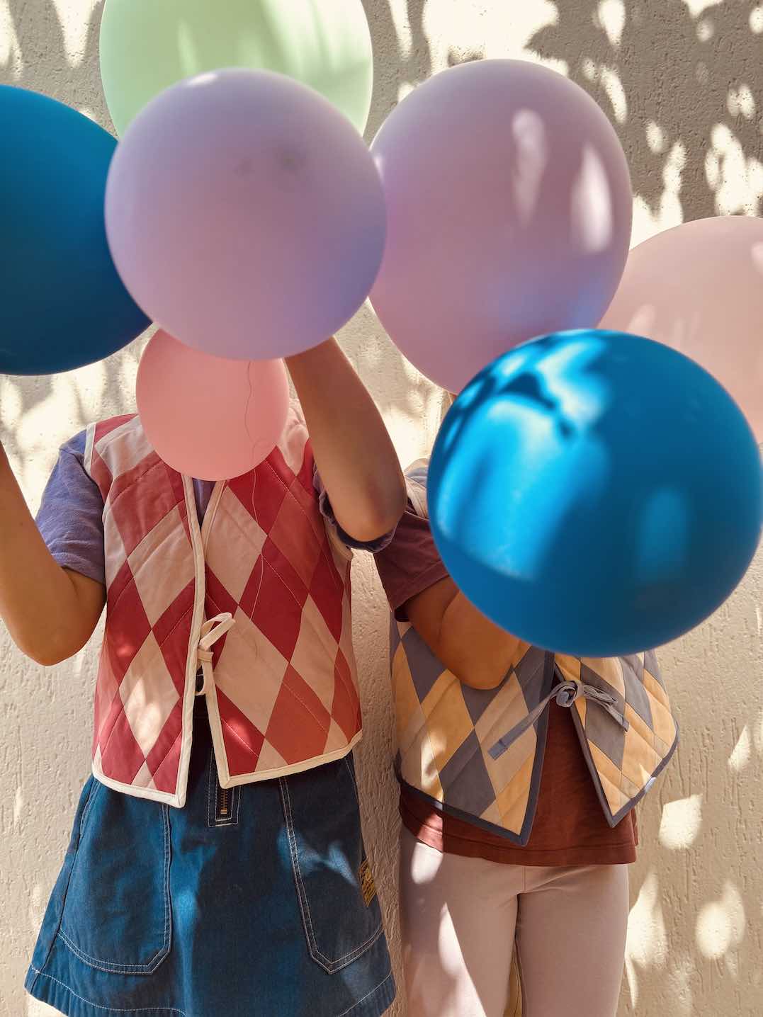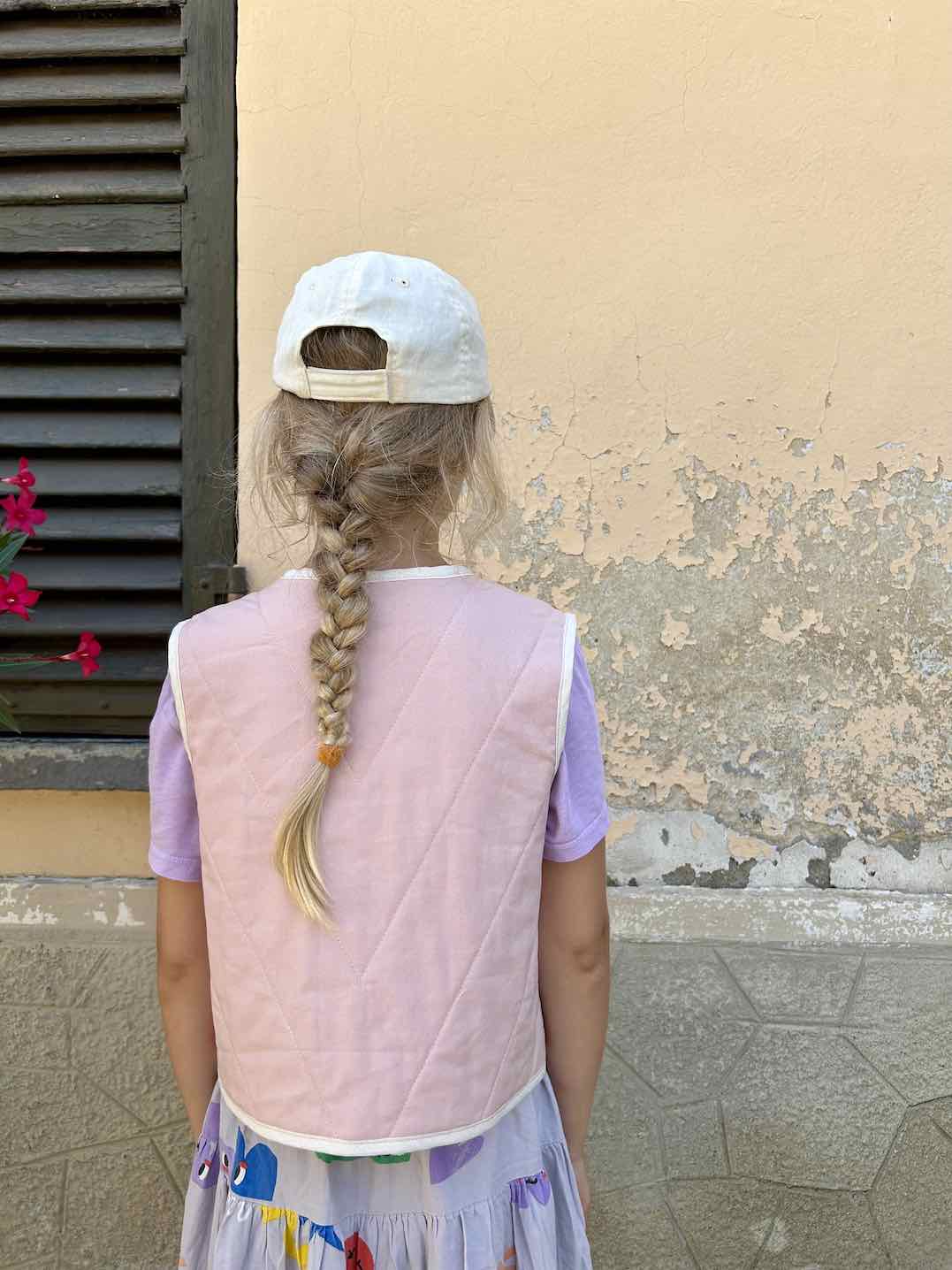 Gequiltete und gefütterte Weste zum Wenden in einem pink- und rosafarbenen Rautenmuster.