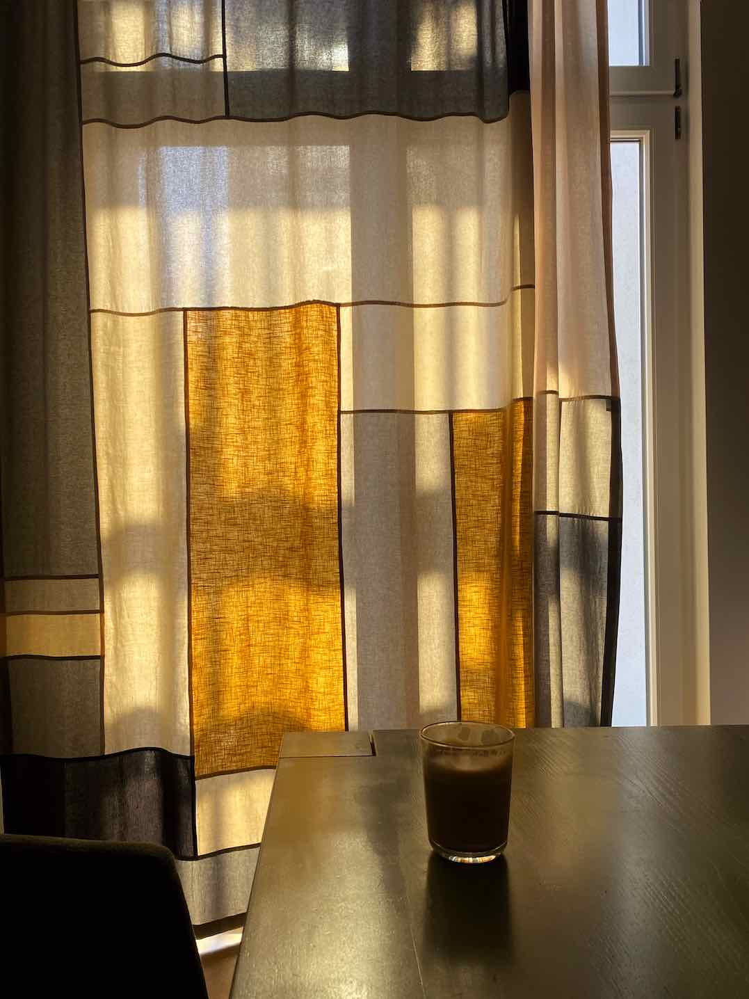 Es ist ein einzelner, großer Vorhang entstanden, der vor der Sonne schützt, aber trotzdem genug Licht durchlässt. Das Senfgelb gibt Wärme und schafft in Kombination mit den Sand- und Grautönen eine schöne Raumatmosphäre.