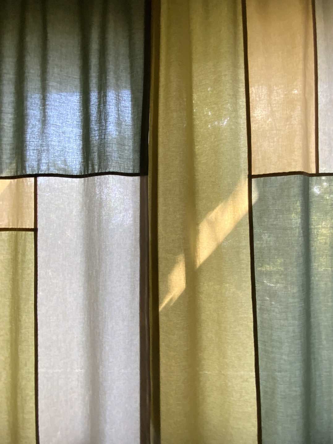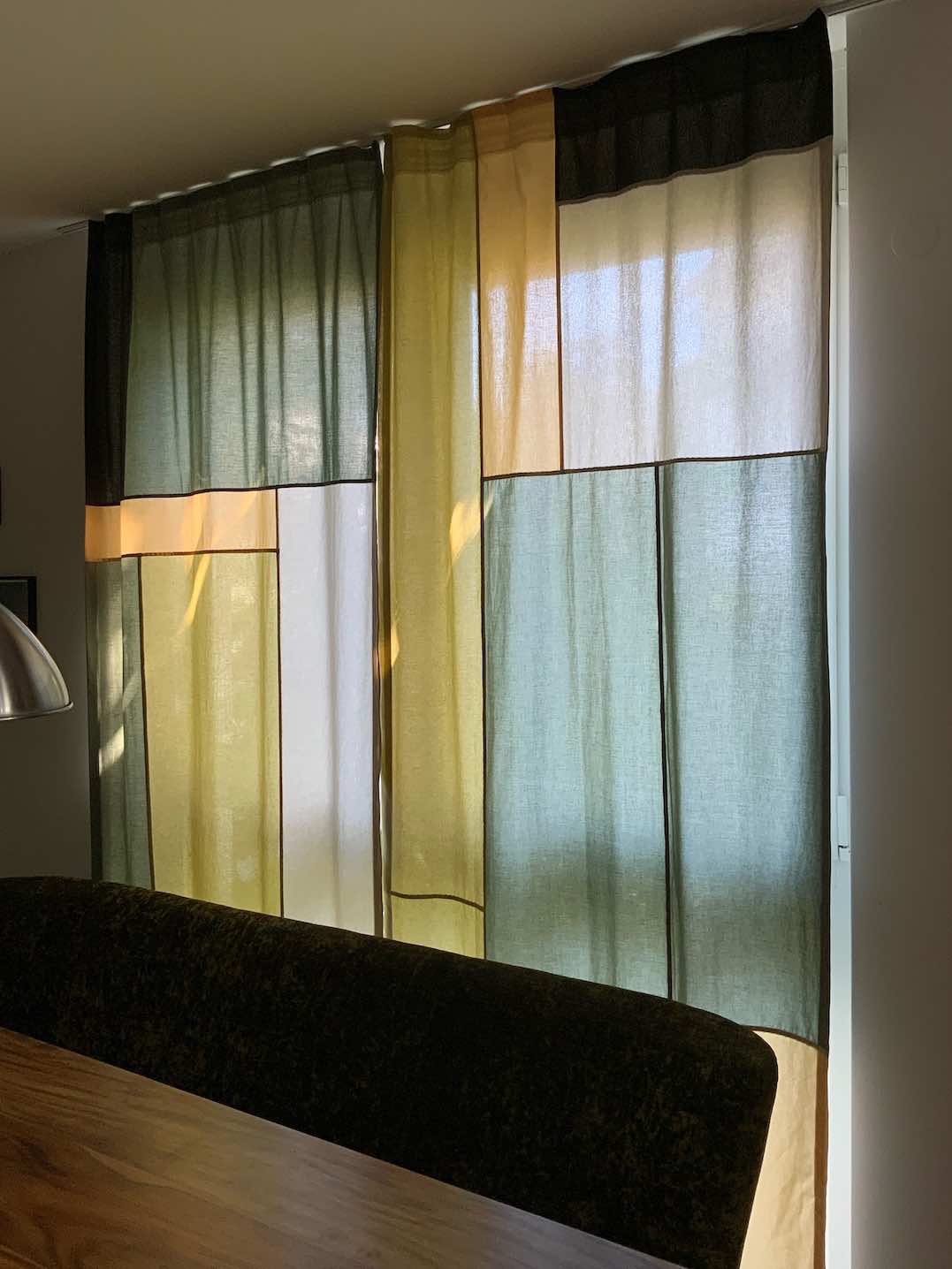 Auch hier dient der Vorhang nicht nur als Sonnenschutz morgens, sondern auch abends als Sichtschutz. Von Außen haben die Farben nochmal eine andere Wirkung. Das Kunstlicht von innen, lässt sie satter und gleichmäßiger erscheinen.