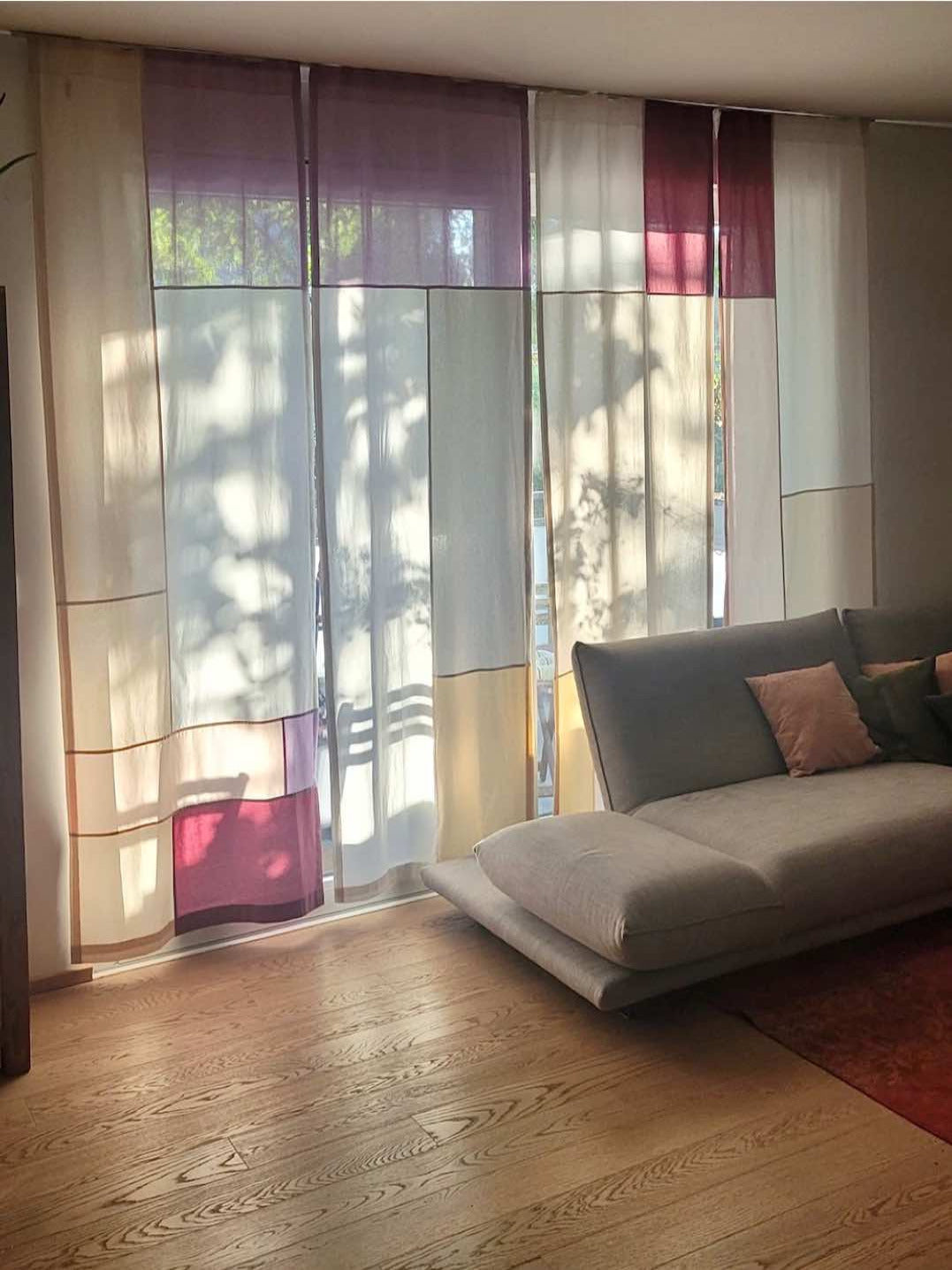 Licht und Wind kann durch die Stoffbahnen hindurch und lässt das Wohnzimmer trotz geschlossener Vorhänge nicht dunkel und abgetrennt wirken. Die rosafarbenen Töne tragen zu einer warmen und angenehmen Atmosphäre bei.