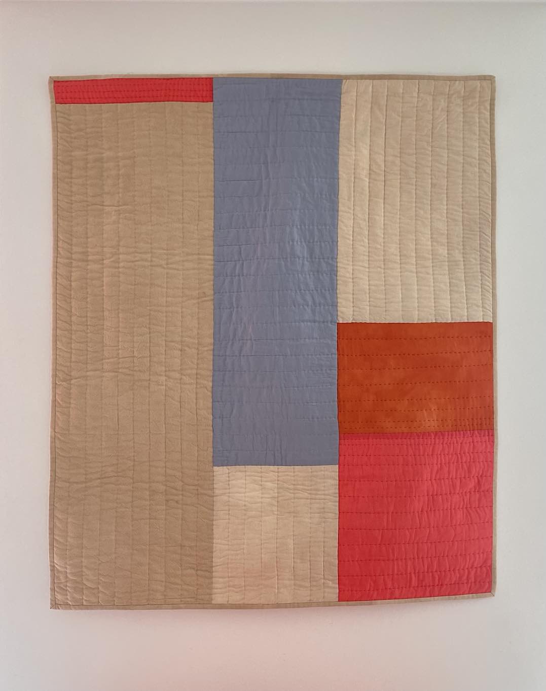 Handgequilteter und gefütterter Wandbehang in coral, beigefarben und graublauen Farbtönen.